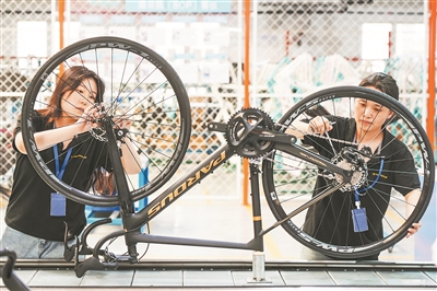 位于山东乐陵经济开发区的泰山体育产业集团为巴黎奥运会的摔跤、自行车、跆拳道、体操、田径等比赛提供器材。图为工人在组装碳纤维自行车。新华社记者 朱峥 摄