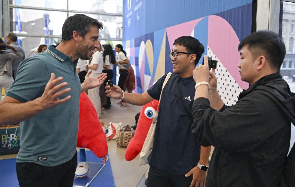 6月27日,巴黎奥组委主席托尼·埃斯坦盖(左)在巴黎奥运会官方特许商品旗舰店接受新华社记者采访。新华社记者 贺长山 摄