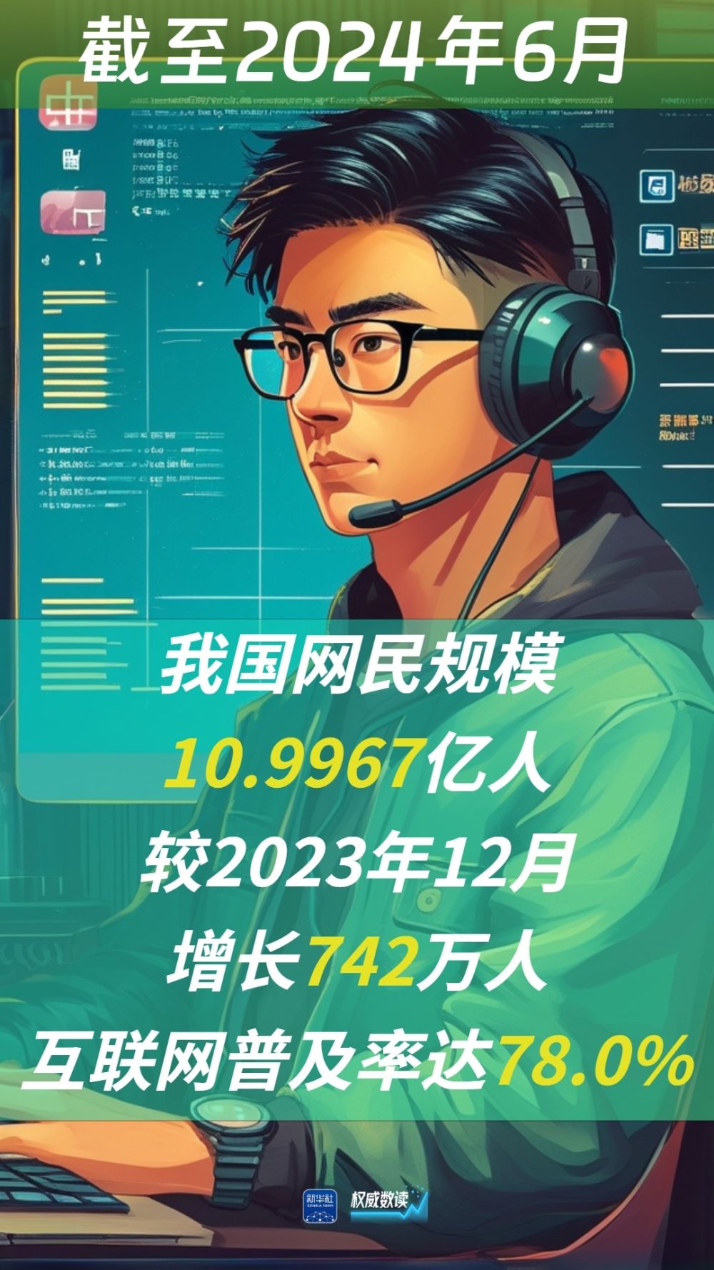 在2024数博会上,中国互联网络信息中心(CNNIC)发布了第54次《中国互联网络发展状况统计报告》。报告显示,截至2024年6月,我国网民规模近11亿人(10.9967亿人),较2023年12月增长742万人,互联网普及率达78.0%。