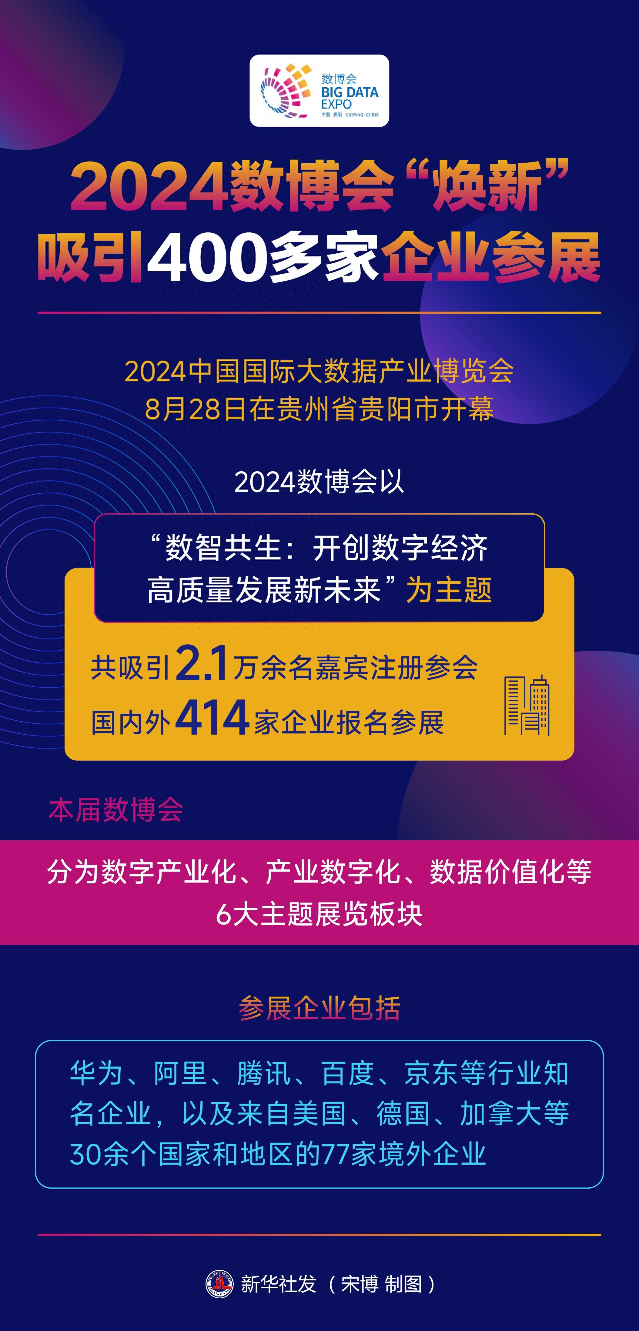本届数博会首次由国家数据局主办,贵州省人民政府承办,共吸引2.1万余名嘉宾注册参会,国内外414家企业报名参展。国家数据局局长刘烈宏在开幕式上说:“历经十年发展,数博会已经成为我国数据领域引领创新趋势、展示行业成果、促进开放合作的重要载体。”